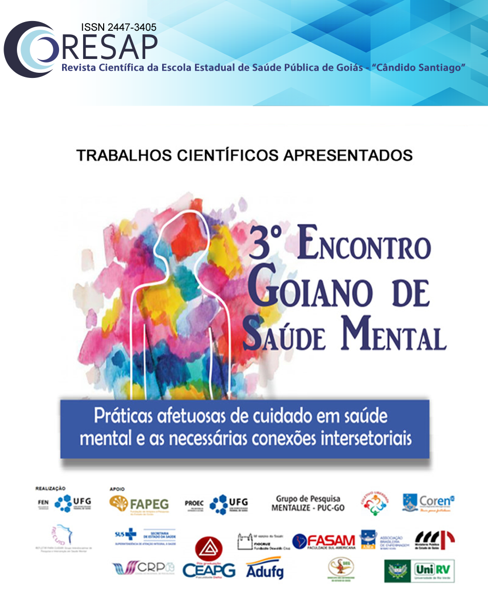 Como parceira deste evento e grande incentivadora desse tipo de ação, a Escola Estadual de Saúde de Goiás publicará nesta edição de sua revista (RESAP) esses resumos como memória deste evento e para fortalecer os avanços na área de saúde mental. Nosso intuito com esta publicação é disponibilizar esses trabalhos para a comunidade acadêmica, científica, profissionais do sistema público de saúde, a fim de dar visibilidade para a defesa do SUS, da Universidade Pública, e dos direitos sociais e da democracia.